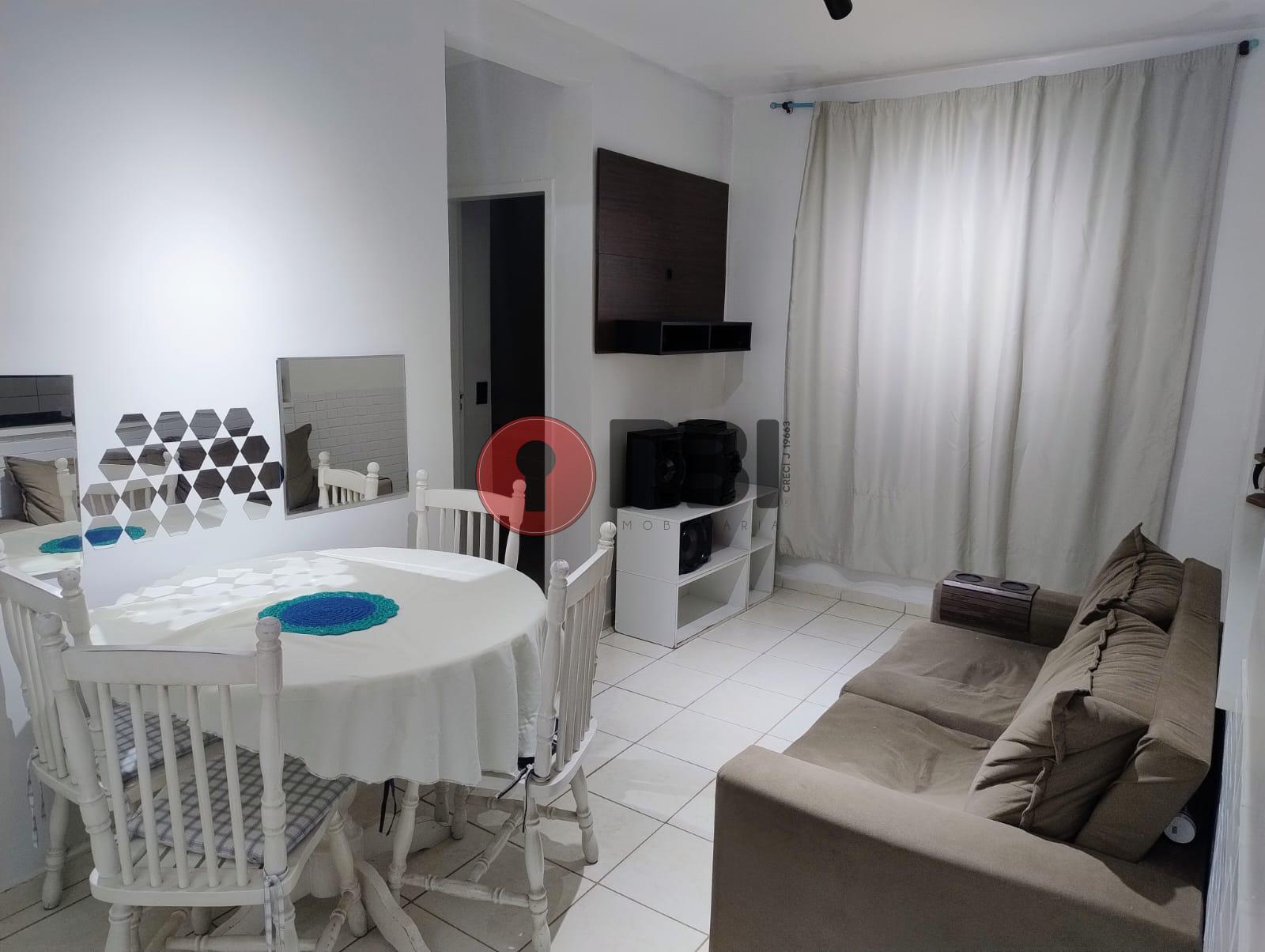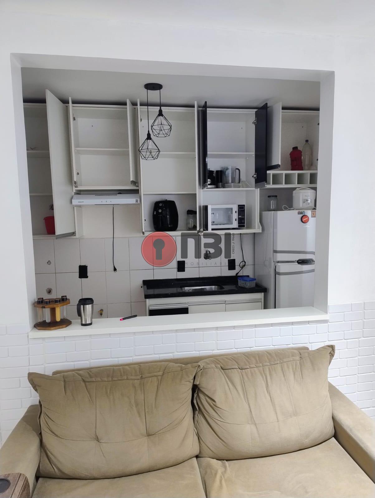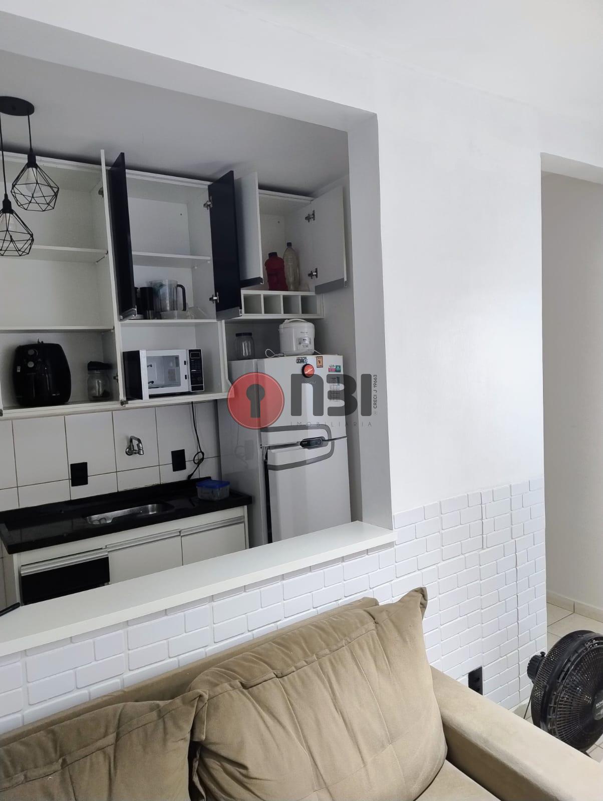 Imóvel divide-se em sala, cozinha planejada com gabinete e armário, 2 quartos, banheiro social, lavanderia, área de serviço, condomínio com portaria, interfone, garagem, área de lazer e piscina.