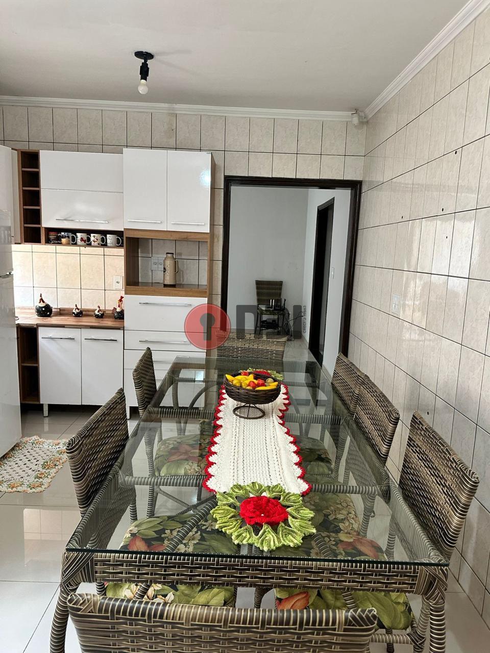 Imóvel divide-se em 2 salas, cozinha, 3 quartos sendo 2 com armários e suítes, banheiro social, lavanderia, área de serviço coberta, despensa (grande), garagem para 3 veículos e quintal.